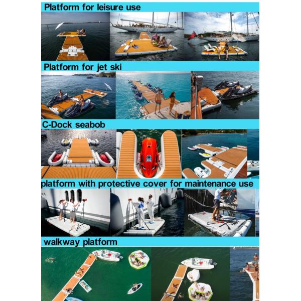 Inflatable Floating Dock is a multi-functional and durable product that is perfect for water floating entertainment, fishing and relaxation. Made from high-quality Drop Stitch PVC and EVA materials, it is lightweight, convenient and easy to set up. This portable inflatable jet ski dock is a versatile and reliable solution for all your water activities.